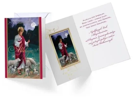 Karnet Wielkanoc Kartka wielkości B6. Karnet wielkanocny, posiada delikatne złote zdobienia. Kartka posiada tekst w środku, dołączona jest do niej koperta.