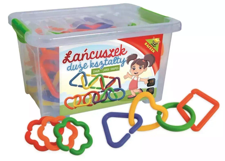 Zestaw kolorowych dużych kształtów zawierający 59 elementów. Kształty łącząc się ze sobą tworzą kolorowy łańcuszek o dowolnej długości. Łańcuszek może posłużyć jako zawieszka np. do zabawek czy też innych dziecięcych skarbów. Dodatkowo dziecko może sortować elementy według koloru lub kształtu. Jest to zestaw, który zapewni Twojemu dziecku wiele radości z zabawy. Całość zapakowana w plastikowe zamykane pudełko z rączką, które ułatwi przechowywanie.
