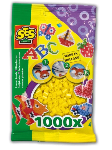 Zestaw koralików do prasowanek zawiera 1000 sztuk żółtych koralików i jest odpowiedni dla dzieci w wieku 5 lat i starszych.