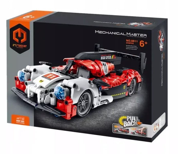 Klocki przedstawiają super wyścigówkę w kolorze czerwonym, wyposażoną w funkcję pull and back.