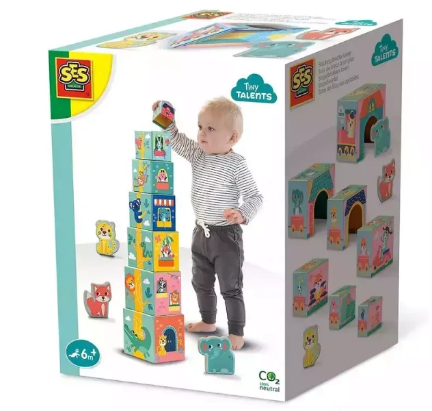 Zaczynaj układać! Dzięki tej wieży z klocków do układania od SES Creative dzieci mogą bawić się godzinami. Siedem otwartych klocków do układania z super zabawnymi ilustracjami jest domem dla trzech drewnianych figurek zwierząt dołączonych do tego zestawu! Układaj klocki na różne sposoby i pozwól zwierzętom przejść przez otwory w wieży. Każda strona wieży tworzy nowy stos lub rząd z innym motywem. Stwórz pociąg, drzewo, ulicę, wieżę i wiele więcej! Klocki łatwo się wsuwają, co sprawia, że są bardzo łatwe do przechowywania i oszczędzają miejsce.