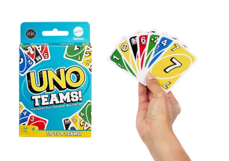 UNO Teams to nowa odsłona klasycznej gry. Gracze dopasowują karty kolorami, cyframi i symbolami, ale zamiast walczyć w pojedynkę, zmierzają ku zwycięstwu w dwuosobowych drużynach. Reguły i karty specjalne pomagają członkom drużyny współpracować, ale aby wygrać, obie osoby w drużynie muszą pozbyć się wszystkich swoich kart. Nie zapomnij, że trzeba krzyknąć „UNO”, gdy Tobie lub partnerowi zostanie w ręku tylko jedna karta.