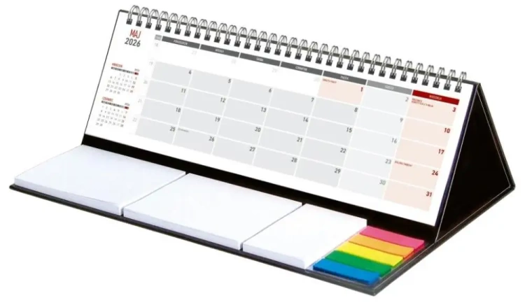Praktyczny kalendarz szkolny na biurko z przejrzystym kalendarium w układzie trzymiesięcznym. Poręczne samoprzylepne karteczki do notowania.