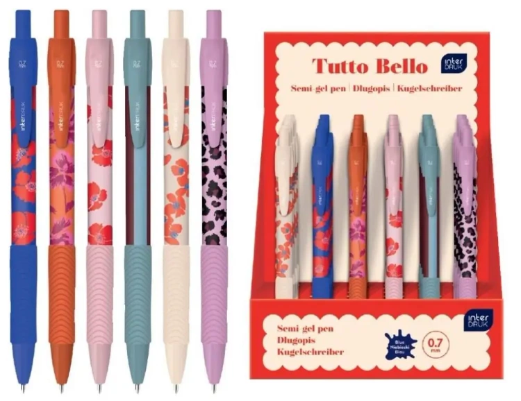 Długopis Tutto Bello to połączenie komfortu i stylowego designu. Niebieski wkład żelowo-olejowy. Wygodny, gumowy uchwyt. Grubość linii pisania: 0.7 mm. Dostępny w 6 stylowych wzorach. 24 szt. w displayu.