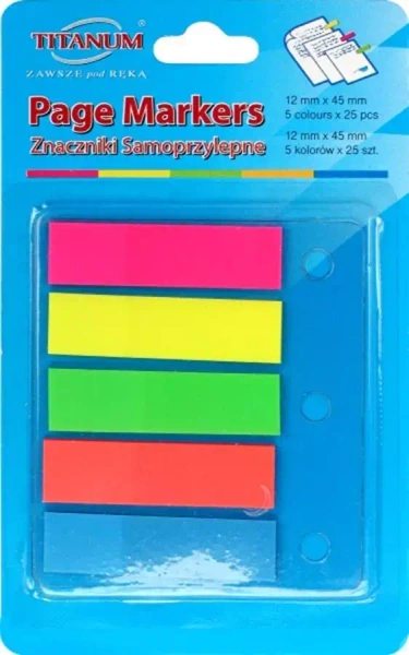 Zakładki indeksujące wykonane z folii polipropylenowej; 5 kolorów fluo; rozmiar 12 x 45 mm.