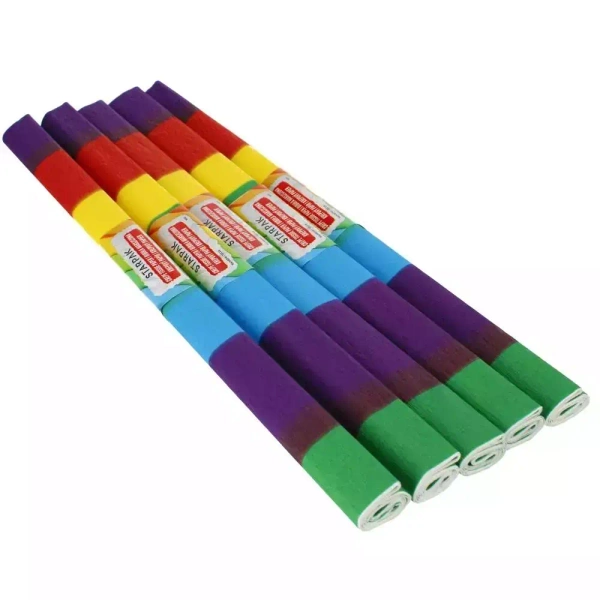 Bibuła marszczona w kolorach tęczy – niezbędna każdemu uczniowi na zajęciach plastycznych.