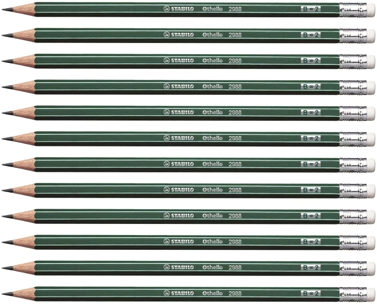 STABILO Othello - popularny ołówek techniczny z gumką dostępny w 3 twardościach. Idealny dla artystów oraz amatorów, uczniów, studentów i wszystkich, którzy potrzebują ołówka. Klejony grafit zwiększa jego odporność na złamania. Wykonany z ogromną starannością i dbałością o szczegóły. Pokryty gładkim lakierem, z charakterystycznymi dla STABILO jasnymi pasami. Idealny do pisania, rysowania i cieniowania. Twardość B.