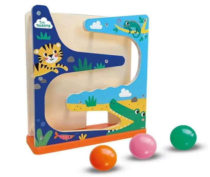 Ta zabawna ścieżka z trzema drewnianymi kulkami zapewni Twojemu maluchowi rozrywkę na wiele godzin. Umieść kulkę na górze drewnianej ramy i obserwuj, jak wtacza się do paszczy krokodyla! Dzięki zabawnym ilustracjom na ramie i trzem kolorowym kulkom Twoje maluchy rozwiną swoje umiejętności motoryczne podczas zabawy!