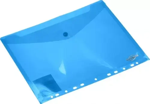 teczka kopertowa na zatrzask z europerforacją umożliwiającą wpięcie teczki do segregatora format A4 pozioma wykonana z polipropylenowej folii o transparentnej, lekko matowej, prążkowanej fakturze kolor niebieski
