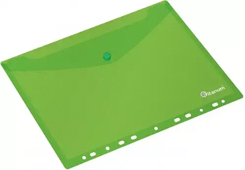 Teczka kopertowa na zatrzask z europerforacją umożliwiającą wpięcie teczki do segregatora. Format A4, pozioma, wykonana z polipropylenowej folii o transparentnej, lekko matowej, prążkowanej fakturze. Kolor zielony.