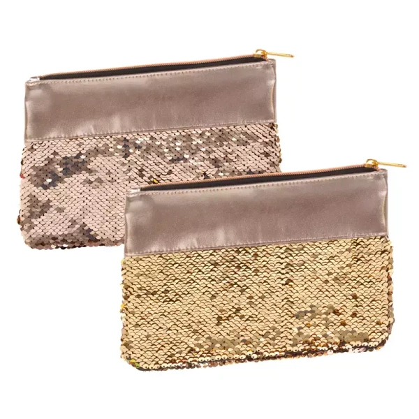 Błyszcząca saszetka o wymiarach 12,5 cm x 20,5 cm, pokryta cekinami, do przechowywania niezbędnych drobiazgów i kosmetyków.