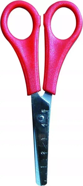 nożyczki szkolne z podziałką uchwyt dostępny w 3 kolorach czerwonym, niebieskim, żółtym długość całkowita 13 cm długość ostrza 5,8 cm zaokrąglone ostrze display 30 szt.