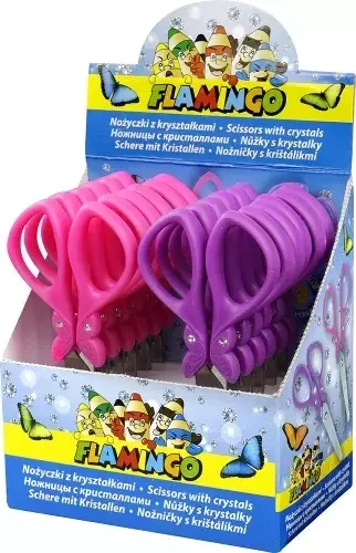 Przedstawiamy nożyczki szkolne z rączką w kształcie motylka. Plastikowe rączki, w zależności od modelu, są fioletowe lub różowe. Długość ostrza wynosi 6.0 cm, a długość nożyczek to 13.5 cm.