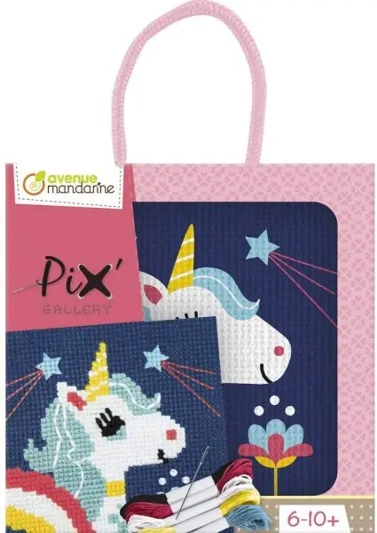 Wyszywanka Pix Gallery Jednorożec AVENUE MANDARINE to idealny zestaw dla dzieci w wieku 6-10 lat, które lubią twórcze zajęcia. Dzięki niemu, dziecko będzie mogło stworzyć własnoręczne dzieło i obudować je włączoną w zestaw kartonową ramkę. Zestaw zawiera: - Tkaninę ze ściegiem krzyżykowym o wymiarach 12,7x12,7 cm, - Kartonową ramkę w rozmiarze 14x2x14 cm, - 5 różnych kolorów nici, - Igłę, - Instrukcję obsługi. Wszystko to schludnie zapakowane w opakowanie o wymiarach 15x1,5x19 cm.Kreatywna zabawa dla dzieciaków