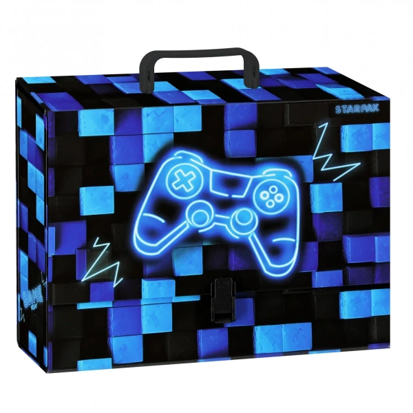 Teczka z rączką z kolekcji STARPAK z serii Gaming. Sztywna teczka wykonana z grubego, lakierowanego kartonu. Zamykana na plastikowy klips. Teczkę wyposażono w solidną rączkę. Teczka o szerokości grzbietu 9,5 cm. Idealnie sprawdzi się na zajęciach pozaszkolnych czy do przechowywania prac dziecka. Zapoznaj się również z innymi produktami z tej serii! Wymiary/waga: wymiary produktu (szer. x wys. x gł.)[cm]: 33x25x10, waga produktu [kg]: 0,52 kg. Produkt przeznaczony dla dzieci w wieku: 3+.