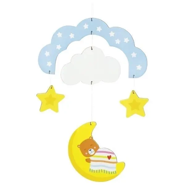 Drewniana ozdoba do zawieszenia nad łóżkiem lub w pokoju dziecięcym. Uspokajające nocne motywy i delikatne barwy przyciągają wzrok malucha, stymulując zmysł wzroku i wyciszając przed snem. Pomaga budować poczucie bezpieczeństwa i rozwija wyobraźnię.