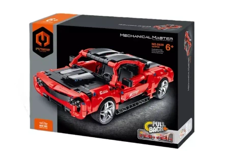 Klocki przedstawiają sportowe auto w kolorze czerwonym, wyposażone w funkcję pull and back.