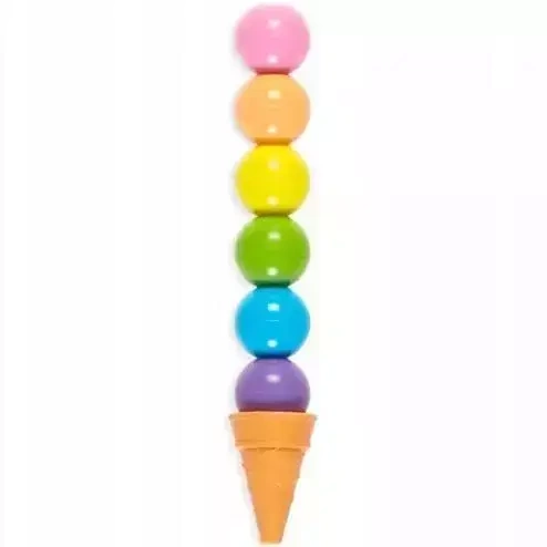 Przekładane kredki w kształcie kulkowych lodów w wafelku, można układać jedną w drugą - w szeregu. Każda z 6 gałek lodów to jeden kolor kredki, którą da się łatwo wymazać za pomocą gumki. Kolory kredek można dowolnie miksować i zmieniać ich kolejność. Stożek - wafelek to gumka do ścierania o zapachu wanilii! Ułóż kolorowe kuleczki po swojemu!