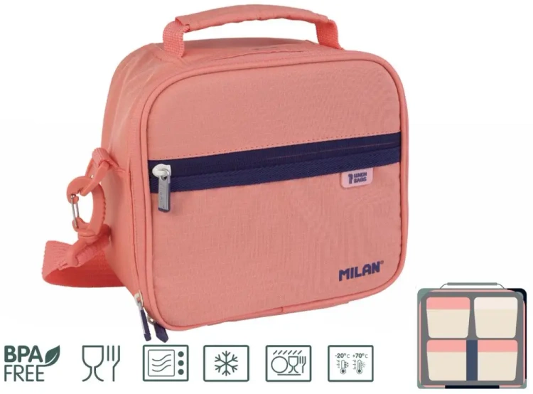 Różowa torba termiczna Milan z kolekcji 1918 wyróżnia się gładkimi wykończeniami i zdolnością do izolacji termicznej, zarówno dla ciepłych, jak i zimnych produktów, zapewniając skuteczne przechowywanie żywności. Pełne otwarcie torby ułatwia dostęp do zawartości oraz utrzymanie jej w czystości. Torba jest wyposażona w praktyczną wewnętrzną kieszeń na zamek, a także małą, zewnętrzną kieszeń, która również jest zamykana na zamek. Wyposażona jest w regulowany i odpinany pasek na ramię oraz uchwyt do noszenia lub zawieszenia. SERIA 1918 została zaprojektowana z inspiracji oryginalnymi kolorami i wzornictwem gumek MILAN. Zewnętrzna tkanina "Ripstop" jest lekka i odporna na rozdarcia dzięki specjalnej technice, która tworzy grube, wzmacniane nici w regularnych odstępach, formując wzór krzyżowy. Torba wykonana jest z materiału zewnętrznego 100% poliester i izotermicznej podszewki (P.E.V.A.). Rozmiar torebki to 23 x 20 x 11 cm, a jej pojemność wynosi 3,5 litra. W skład zestawu wchodzi: duży prostokątny biały pojemnik 0,75l, kwadratowy biały pojemnik 0,33l oraz mały okrągły granatowy pojemnik 0,25l z zakręcaną pokrywką. Duży pojemnik jest wyposażony w wewnętrzną przegrodą, która pozwala na rozdzielanie dwóch różnych rodzajów żywności, a także w granatowy elastyczny silikonowy pasek. Pojemniki nadają się do odgrzewania w mikrofalówce (do maks. 70oC) z otwartą pokrywką, co pozwala na uwolnienie pary. Można je również przechowywać w zamrażarce (do -20oC) oraz myć w zmywarce (maks. 70oC). Pokrywy i pojemniki można ze sobą łatwo łączyć, a ich matowe wykończenie zewnętrzne ułatwia uchwyt. Wnętrze pojemników ma zaokrąglone narożniki i błyszczące wykończenie dla łatwiejszego czyszczenia. Pojemniki wykonane są z tworzywa sztucznego wolnego od BPA.EAN: 8411574096498