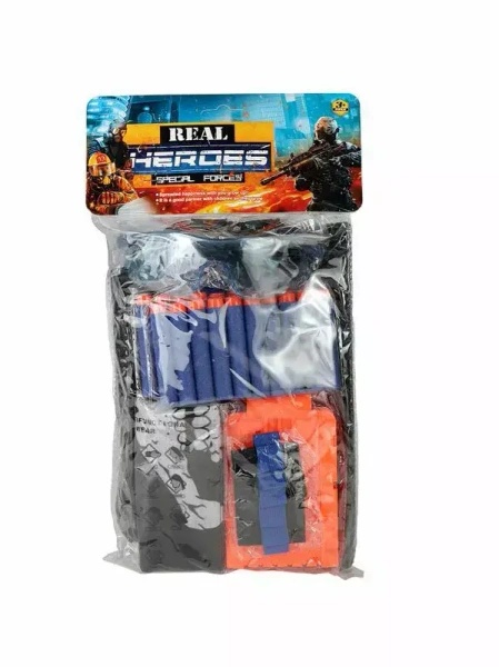 Wysokiej jakości zestaw wyposażenia sił specjalnych. Zawiera kamizelkę antyterrorysty z pasem na naboje (20 sztuk piankowych naboi), okulary taktyczne, komin z kościotrupem oraz magazynek.