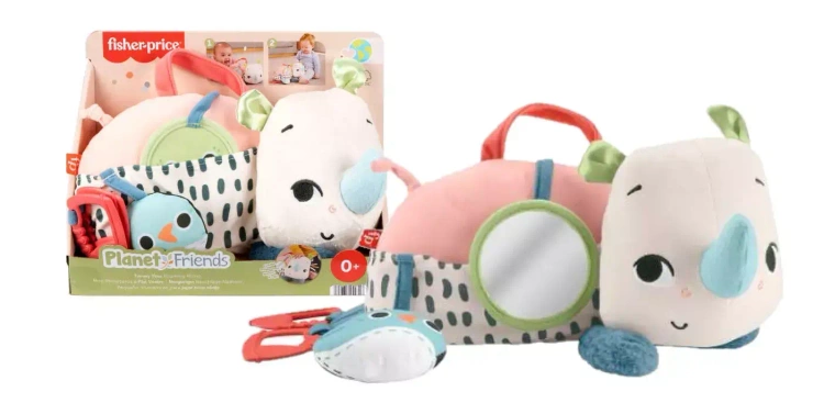 Pluszowa zabawka w kształcie nosorożca dla noworodk oacute w, kt oacute ra rośnie wraz z dzieckiem od leżenia na brzuszku do zabawy na siedząco br / Wykorzystano tkaninę wykonaną w 77,46 z plastiku pochodzącego z recyklingu klekotki wykonane w 25 z plastiku z certyfikatem ISCC podejście bilansu masy opakowanie wykonane z papieru z certyfikatem FSC FSC C172210, 2021 br / Zawiera lusterko do samopoznania, kontrastową grzechotkę w kształcie ptaka i klekotki do odkrywania podczas leżenia na brzuszku, a także boczne kieszenie do zabawy w bdquo zakładanie i noszenie rdquo w miarę wzrostu dziecka br / Tkaniny o teksturowanym wykończeniu, kontrastowe kolory, satynowe uszy oraz dźwięki szeleszczenia i dzwonienia do zabawy sensorycznej, a także łatwy do przenoszenia uchwyt do chwycenia i zabrania w podr oacute ż br / Pomaga wzmacniać mięśnie szyi i brzucha oraz wspomaga rozw oacute j sensoryczny i motoryki małej u niemowląt od urodzenia i starszych
