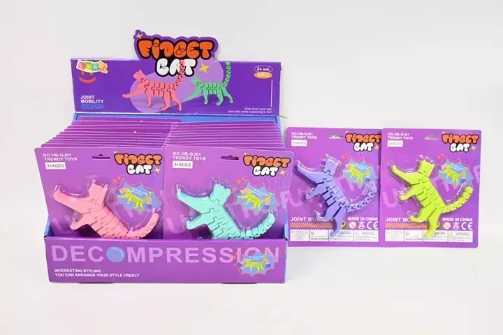 KOT PUZZLE FIDGET 3D - SKŁADANKA ANTYSTRESOWA DLA DZIECI Kot Puzzle Fidget 3D to przestrzenna, elastyczna zabawka manualna, która łączy funkcję układanki, antystresowego gadżetu oraz zabawki sensorycznej. Zbudowany z ruchomych segmentów, pozwala na wyginanie, skręcanie i ustawianie kota w różnych pozycjach. Dzięki trójwymiarowej formie, zapewnia jeszcze większe wrażenia dotykowe i wizualne, stając się ciekawą alternatywą dla klasycznych fidgetów. Zabawka wykonana jest z trwałego tworzywa sztucznego w intensywnych, pastelowych kolorach. Kot 3D świetnie sprawdza się jako narzędzie do ćwiczenia małej motoryki, poprawy koncentracji oraz zabawy kreatywnej. Może służyć również jako dekoracja biurka lub drobny upominek. Kompaktowy rozmiar, przestrzenny kształt i łatwość w użytkowaniu sprawiają, że kotek to świetna zabawka do domu, szkoły i w podróży. W opakowaniu zbiorczym znajduje się 24szt. Sprzedawane osobno. Kolor wybierany losowo. SPECYFIKACJA: Typ produktu: zabawka fidget 3D / antystresowa Kształt: kot (forma przestrzenna) Wymiary kota: ok.16x 7 x 1cm Wymiary opakowania: 21 x 17,5 x 1cm Wymiary opakowania zbiorczego: 34,5 x 19 x 21,5cm Ruchome segmenty: tak Materiał: tworzywo sztuczne Kolory: mix pastelowy Zastosowanie: zabawa, sensoryka, odstresowanie, rozwój motoryki ZAWARTOŚĆ ZESTAWU: 1 x Kot Puzzle Fidget 3D (kolor losowy)