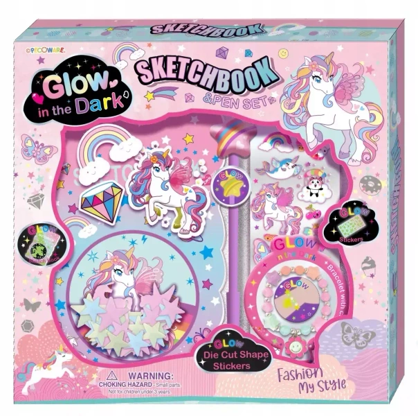 Zestaw zawiera: - sketchbook z czystymi kartkami do rysowania i dekorowania - ozdobny długopis świecący w ciemności - bransoletka z charmsami świecąca w ciemności - ozdobne naklejki świecące w ciemności - arkusz tradycyjnych naklejek - dekoracyjne gwiazdki świecące w ciemności Zestaw zapakowany w ozdobne opakowanie prezentowe. Wiek: 6+