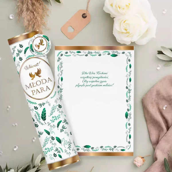Tuba ŚLUBNA, wysokośćh 25cm,średnica 5 cm.Bogato złocona, zamykana stalowymi złotymi wieczkami. W komplecie kartka z życzeniami A4 z obwolutą i bilecikiem. Całość zapakowana w worek foliowy z wstążką i przywieszką.