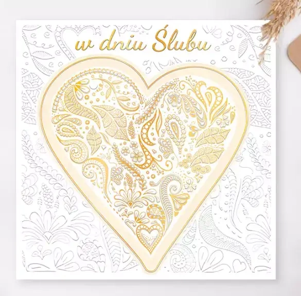 Karnet kwadratowy 15 x 15 cm. Złocony i tłoczony, teksy życzeń w środku. Wydrukowany na wysokiej jakości papierze. W zestawie koperta.