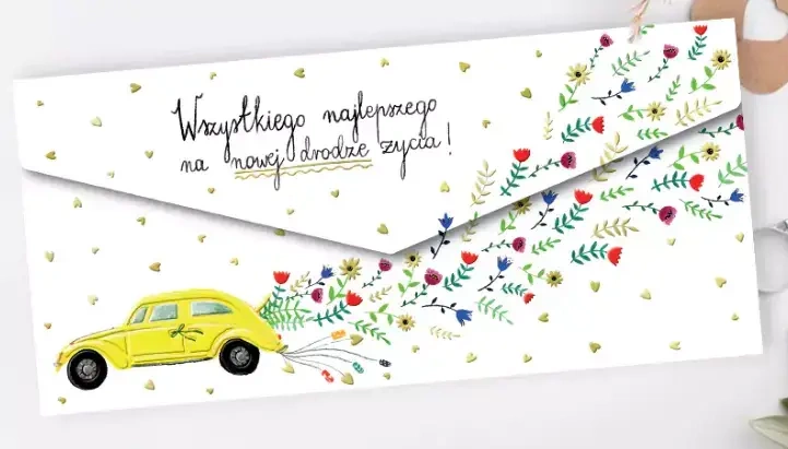 Ozdobna koperta na pieniądze, złocona i tłoczona. W zestawie wkałdka z życzeniami oraz koperta ochronna.