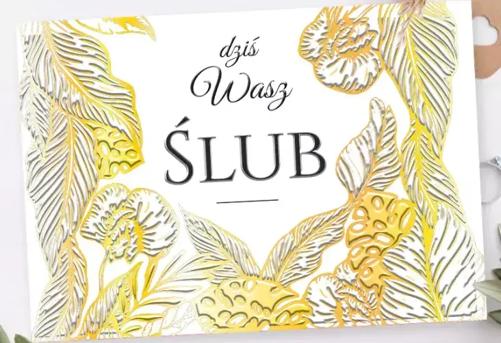 Karne w formacie A5, złocony i tłoczony, teksy życzeń w środku. Wydrukowany na wysokiej jakości papierze. W zestawie koperta.
