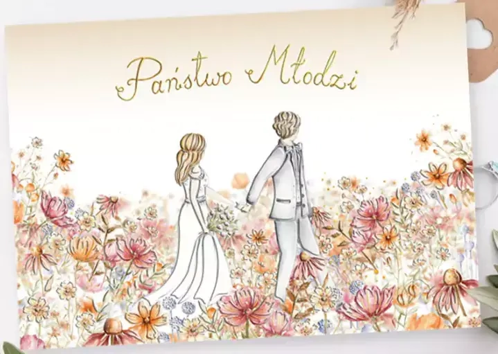 Karne w formacie A5, złocony i tłoczony, teksy życzeń w środku. Wydrukowany na wysokiej jakości papierze. W zestawie koperta.