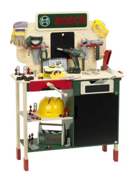 Regulowany na wysokość dziecięcy stół warsztatowy jest wykonany z drewna (MDF) w popularnym wzornictwie firmy Bosch. Blat roboczy oferuje wiele funkcji edukacyjnych, a także praktyczne miejsca do przechowywania akumulatorowej wkrętarki Bosch i fajnej mechanicznej piły tarczowej z efektami dźwiękowymi. Liczne akcesoria można przechowywać pod blatem roboczym - na półkach, w szufladzie i w solidnej skrzynce narzędziowej. We wszystkich tych miejscach jest wystarczająco dużo miejsca na śrubokręty i klucze, młotki, szczypce, piły, kątowniki, miary taśmowe, imadła, a także śruby, nakrętki i elementy gwintowane w różnych rozmiarach i kształtach. Wiele narzędzi dla dzieci można również zawiesić na tylnej ścianie za pomocą praktycznych haczyków. Kask i rękawice ochronne są szczególnie popularne wśród małych rzemieślników, podobnie jak pojazd montażowy 5 w 1 i tablica do pisania, na których można zapisywać plany budowy lub zadania (kreda nie jest dołączona).