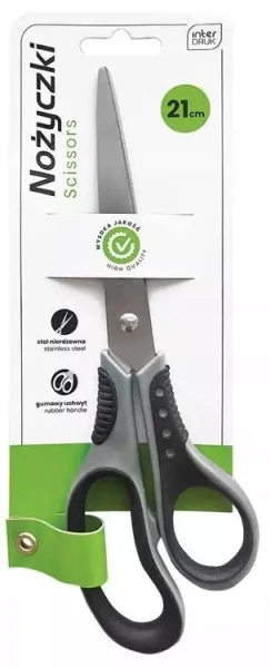 Poręczne nożyczki o długości 21 cm. Precyzyjne ostrze wykonane ze stali nierdzewnej. Gumowy uchwyt o ergonomicznym kształcie zapewnia komfort użytkowania.