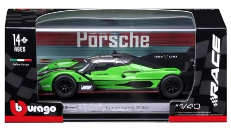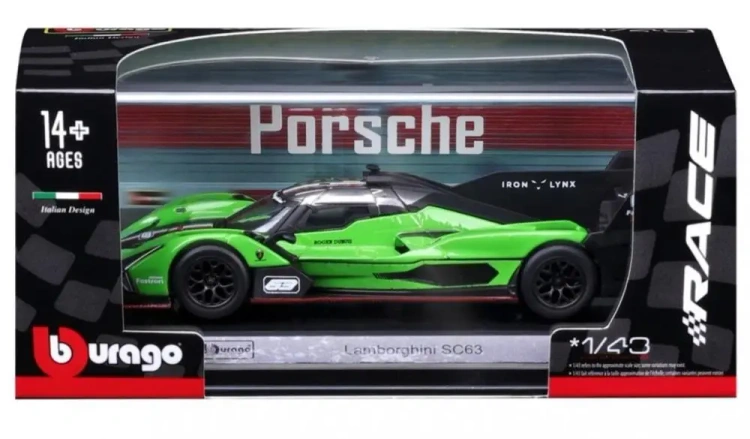 Lamborghini SC63 LMDh oryginalny produkt marki Bburago, oficjalny, licencjonowany wzór pojazdu, metalowy model z plastikowymi elementami, perfekcyjne odwzorowanie szczegółów. Model umieszczony na plastikowej podkładce oraz zamknięty w ochronnej gablotce. Wymiary opakowania: szerokość 14,5cm, głębokość 7cm, wysokość 6,5cm. Lamborghini SC63 to prototypowy samochód wyścigowy klasy LMDh, stworzony przez Lamborghini we współpracy z Ligier. Został zaprojektowany do rywalizacji w kategoriach Hypercar i GTP w FIA World Endurance Championship oraz IMSA SportsCar Championship. Wyposażony w hybrydowy układ napędowy składający się z 90-stopniowego, podwójnie doładowanego silnika V8 oraz standardowych komponentów hybrydowych od Williams Advanced Engineering, Bosch i Xtrac, osiąga maksymalną moc 671 KM. Oficjalna prezentacja odbyła się 13 lipca 2023 roku podczas Goodwood Festival of Speed. Fabryczny program wyścigowy prowadzony jest przez zespół Iron Lynx, który zarządza również startami Lamborghini w wyścigach GT3. Pierwsze testy SC63 miały miejsce na torze Vallelunga w sierpniu 2023 roku, a następnie na Imoli, gdzie samochód pokonał ponad 1500 km.