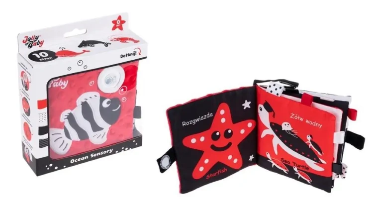 Wraz z materiałową książeczką poznaj stworzenia mieszkające w głębi oceanu. Na dziesięciu sensorycznych stronach znajdziesz ich podobizny oraz nazwy w języku polskim i angielskim. Ta niepozorna książeczka stymuluje zmysły najmłodszych, za sprawą kontrastowych kolorów, zróżnicowanych materiałów, z których została wykonana, oraz szeleszczącej okładki z bezpiecznym lusterkiem. Zapinany na rzep uchwyt pozwoli przymocować książeczkę w dowolnym miejscu.
