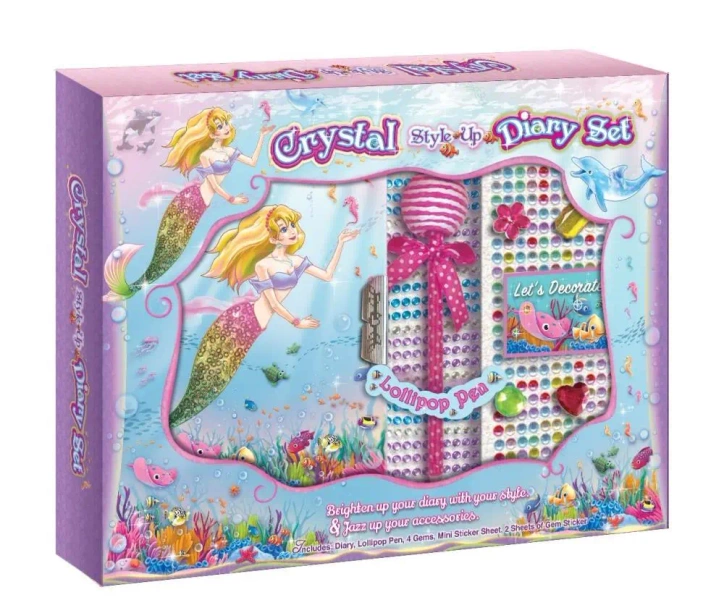 Zestaw zawiera: - mini pamiętnik z kolorowymi kartkami zamykany na zamek - długopis w kształcie lizaka - 4 duże kryształki w różnych kształtach i kolorach - mini zestaw naklejek - 2 arkusze malutkich kolorowych kryształków do wyklejania Wiek: 6+