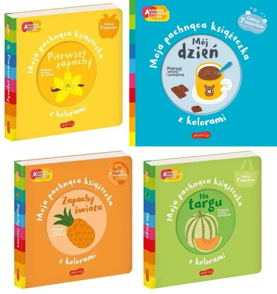 To nowa seria książeczek przeznaczona dla najmłodszych. Na każdej stronie maluch uczy się nowych kolorów, poznaje rzeczy powiązane z daną barwą oraz dzięki potarciu paluszkiem o stronę poznaje zapachy.