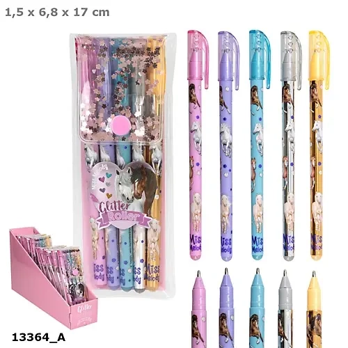 Zestaw 5 brokatowych żelpenów Miss Melody, z wizerunkiem koników. Kolory: srebrny, złoty, fioletowy, różowy i niebieski.