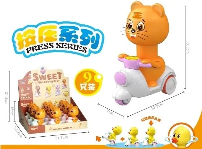 Zabawny Tygrys na Motorze - Radość z Każdym Naciśnięciem! (Opakowanie zbiorcze 9 sztuk) Przedstawiamy niezwykle sympatycznego Tygryska na Motorze, który z pewnością wywoła uśmiech na twarzy każdego dziecka. Ten kolorowy i interaktywny pojazd to prosta, a zarazem wciągająca zabawka. Aby wprawić tygryska w ruch, wystarczy nacisnąć jego głowę, a on pomknie przed siebie, dostarczając mnóstwo frajdy. Zabawka charakteryzuje się prostą obsługą, dzięki czemu nawet najmłodsze dzieci poradzą sobie z nią bez problemu. Kompaktowe rozmiary sprawiają, że tygrysek na motorze idealnie mieści się w małych rączkach i można go zabrać ze sobą wszędzie. Opakowanie zbiorcze zawiera aż 9 sztuk uroczych tygrysków na motorach, co czyni go doskonałym wyborem dla przedszkoli, sal zabaw, jako nagrody w konkursach lub po prostu jako większy zapas ulubionych zabawek. Cena za 1szt.