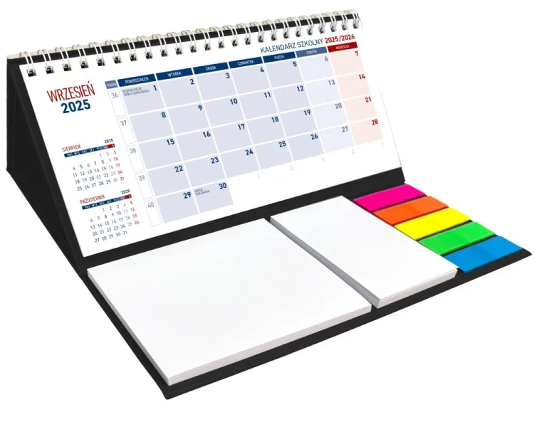 Praktyczny kalendarz szkolny na biurko z przejrzystym kalendarium w układzie trzymiesięcznym. Poręczne samoprzylepne karteczki do notowania.