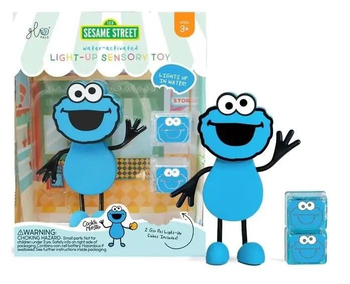 Glo Pals, Zestaw postać Ciasteczkowy Potwór oraz 2 kostki sensoryczne świecące w wodzie. Świecące kostki i postać w nowej odsłonie - seria z kultowymi bohaterami z bajki Ulica Sezamkowa.
