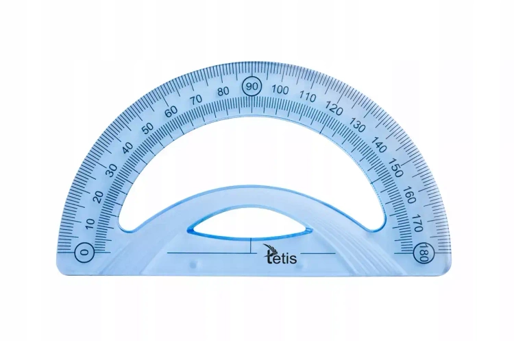 Kątomierz wykonany z przezroczystego tworzywa z wyraźną skalą. Kolor niebieski