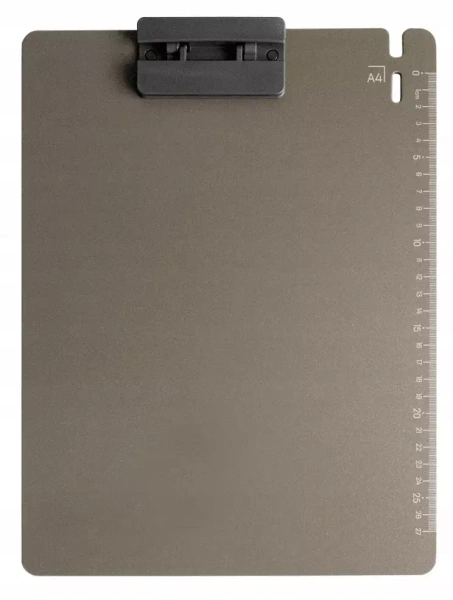 Deska z klipem, format A4. Wykonana z wytrzymałego i elastycznego tworzywa. Posiada podziałkę w skali CM na dłuższym boku. Kolor szary. Grubość tworzywa: 1,5mm.