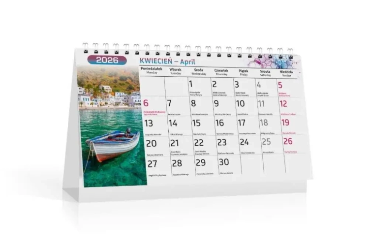 "Kalendarz biurkowy typu namiot, kalendarium w układzie miesięcznym, 24 strony + okładka. Na spirali, papier w środku kreda mat. Wymiary 240x165 mm"