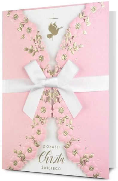 Kartka jest bogato i różnorodnie zdobiona (zależnie od wzoru: metaliczna folia, lakier perłowy, brokat, przyklejone elementy 3D - wypukłe wstawki papierowe, elementy biżuteryjne, tłoczenia).