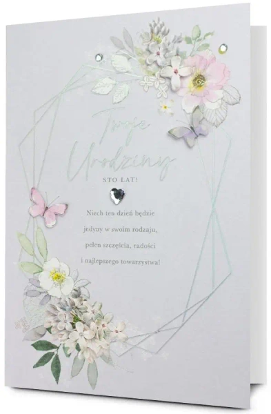 Kartka jest bogato i różnorodnie zdobiona (zależnie od wzoru: metaliczna folia, lakier perłowy, brokat, przyklejone elementy 3D - wypukłe wstawki papierowe, elementy biżuteryjne, tłoczenia).