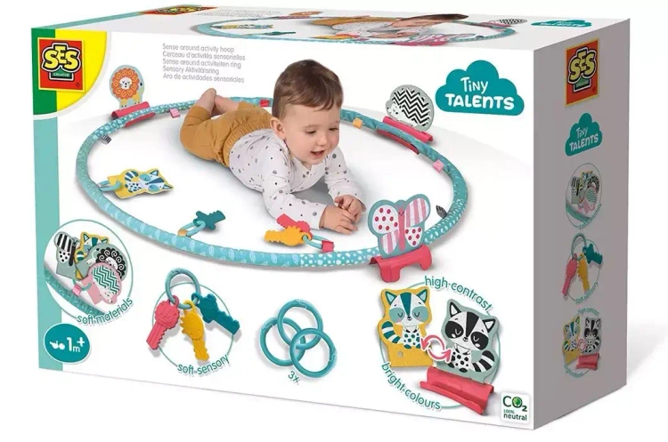 Dzieci mają wiele do odkrycia na tym kółku do zabawy moga to robić wszystkimi zmysłami. Zabawne, dwustronne karty ze zwierzętami, kolorowe i czarno-białe, z motywami takimi jak silny lew lub puszysty kot, są idealne do rozpoznawania kontrastów oraz podnoszenia i trzymania główki. Kolorowe klucze idealnie nadają się do podgryzania i gryzienia podczas ząbkowania, a na niebieskich kółkach można zawiesić dodatkowe przedmioty.