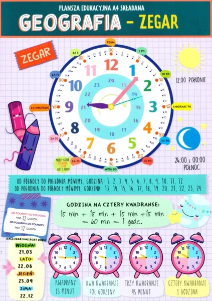 Karta edukacyjna 4 strony składana geografia - zegar