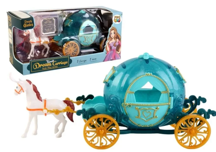Zabawka tematyczna z serii odgrywania ról, przedstawiająca bajkową karocę z koniem, inspirowaną klasycznym motywem baśniowym. Komplet zawiera zaprzęg z plastikowym koniem oraz ozdobną karocę w kształcie turkusowego dynio wozu z otwieranymi oknami. Produkt został zaprojektowany z myślą o dzieciach od 3. roku życia i rozwija kreatywność, wyobraźnię narracyjną oraz motorykę małą.